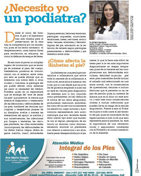 Profesional médica, especialista en Podiatría, postgrado en diabetes, curso y entrenamiento en pie diabético, comprometida con la prevención, diagnóstico y atención integral del pie humano basada en la enseñanza recibida del conocimiento, dedicación, experiencia e integralidad, para más de las 300 afecciones que puede sufrir el pie, entre ellas y como consecuencia de la diabetes el pie diabetico, osteo neuroartropatía de Charcot entre muchas.